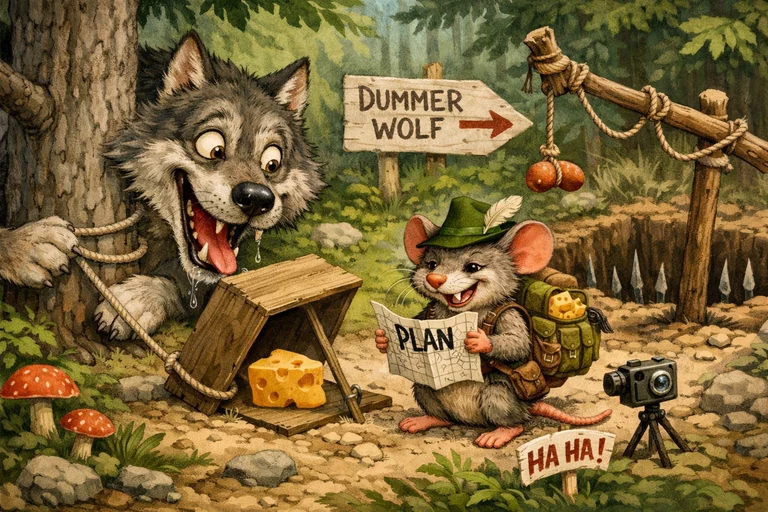 Der Wolf grinste, überzeugt davon, dass er diesen einfachen Wettlauf leicht gewinnen würde. Doch die Maus hatte einen Trick vorbereitet. Sie hatte einen geheimen Tunnel unter der Eiche gegraben, der direkt zur anderen Seite führte.